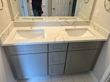 Its polished finish enhances the depth and movement within the design, allowing light to reflect subtly across the surface and highlight the gentle contrast between the warm undertones and cool, muted veins. Whether used in a bathroom vanity, kitchen countertop, or statement island, Calacatta Maple Quartz brings an effortless balance of luxury and tranquility to any space.