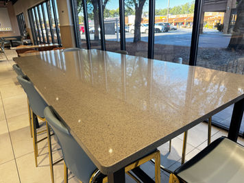 Paired with warm wood paneling and ambient pendant lighting, this countertop transforms the space into an inviting and upscale environment, ideal for cafes, restaurants, or high-end service areas. Designed for both style and function, this quartz is stain-resistant, low-maintenance, and built to withstand the daily demands of a busy commercial setting.