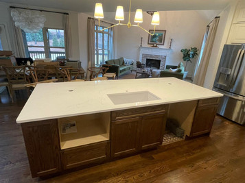 It features a subtle yet elegant design characterized by light grey and white tones. The surface showcases a natural-looking veining pattern that mimics the appearance of marble, with delicate, wispy lines running throughout the slab. These veins vary in thickness and direction, adding a sense of depth and sophistication to the countertop. The overall aesthetic is modern and refined, making it a versatile choice for both contemporary and classic kitchen or bathroom designs. The light color palette helps to brighten spaces, creating an open and airy feel. This quartz countertop is not only visually appealing but also durable and low-maintenance, making it an excellent choice for high-traffic areas.